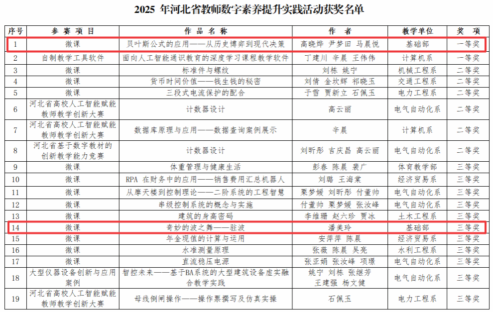 近日,河北省教育厅公布了“2025年河北省教师数字素养提升实践活动”评选结果,我校共19项作品获奖,其中英国上市365报送的两项微课作品全部获奖,数学教研室高晓烨、尹梦田和马晨悦三位老师的微课《贝叶斯公式的应用——从历史博弈到现代决策》获得一等奖,物理教研室潘美玲老师的微课《奇妙的波之舞——驻波》获得三等奖。两项微课作品将数学和物理的学科知识与数字技术有机融合,生动展示了信息技术赋能教学创新的有效路径。