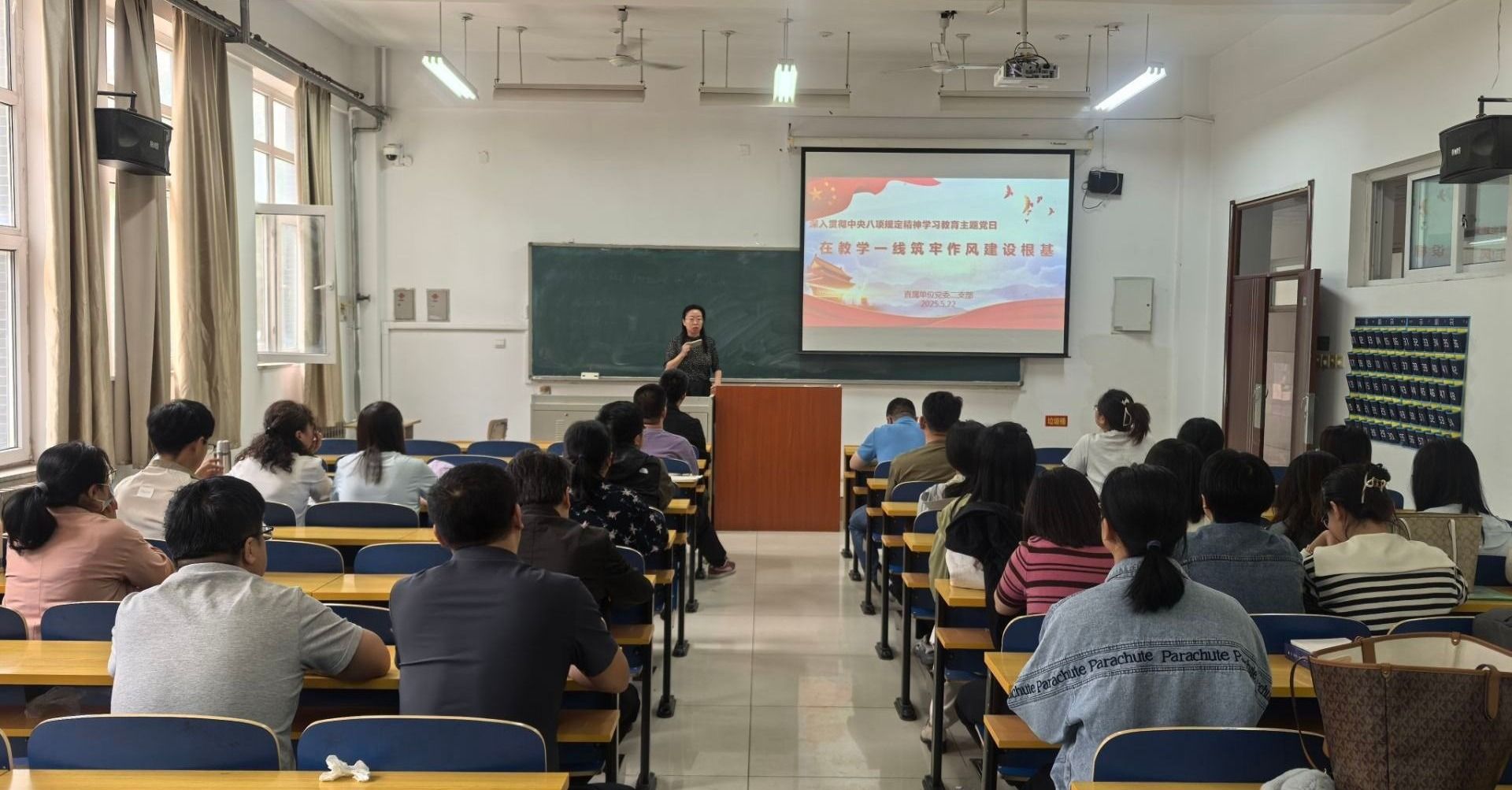 王侠首先传达了学校党委关于开展深入贯彻中央八项规定精神学习教育的相关要求,强调了此次学习教育对于加强党员教师作风建设、提升教育教学质量的重要意义和学习目标。随后,她从为什么学切入,为全体党员解读了中央八项规定及其实施细则,要求全体党员教师要深刻领会其内涵,切实增强纪律意识和规矩意识。王侠指出,基础学科是学生知识体系的“坐标系”,教师作风直接影响学生价值观塑造,全体党员教师要以此次学习为契机,进一步提高政治站位,强化责任担当,在日常教学工作中,加强师德师风建设,注重改进工作作风,树立良好的教师形象,以学生为中心,切实把中央八项规定精神落实到教育教学的每一个环节。