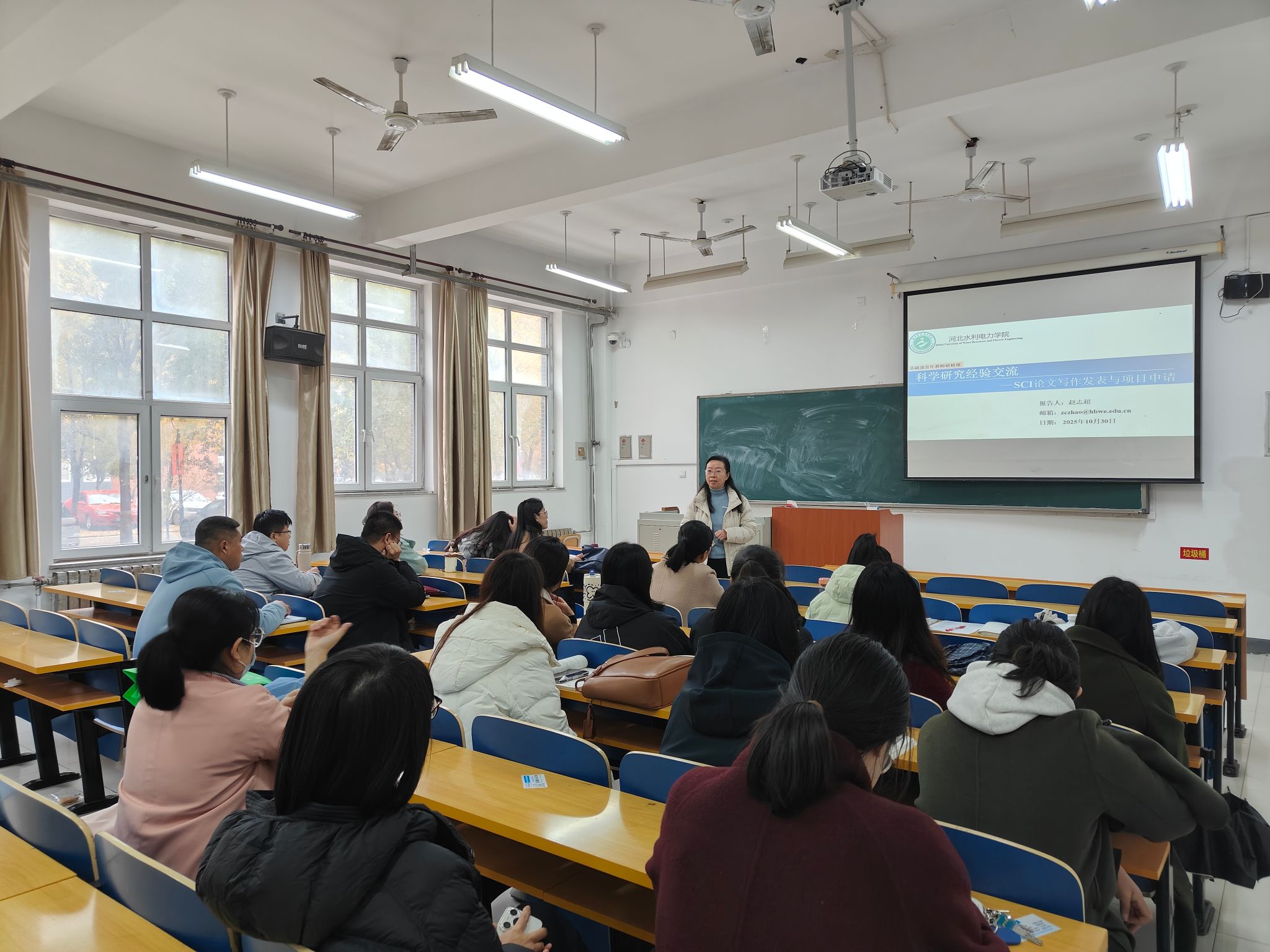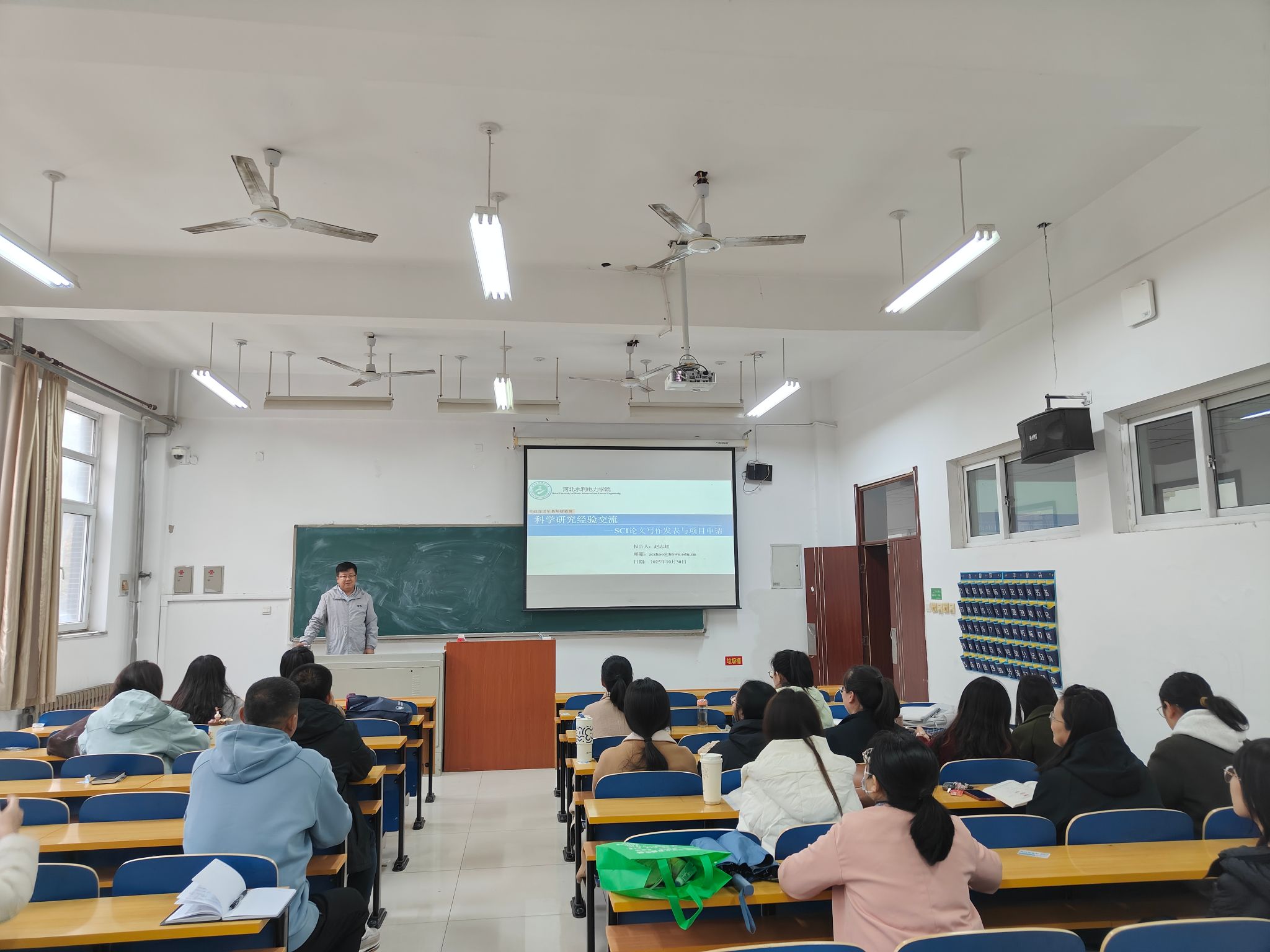 交流过程中,赵老师从SCI论文的选题、构思、撰写和投稿四个方面展开,分享了自己在论文写作、投稿和审稿方面的宝贵经验。关于项目申请,赵老师结合自己已经立项的河北省自然科学基金项目,从项目名称与摘要、立项依据、研究内容、研究目标、拟解决的关键科学问题、拟采取的研究方案及可行性分析、特色与创新之处,年度研究计划及研究成果、研究基础与工作条件等方面具体介绍了科学项目的申报要点。不同于校外专家的学术经验交流,赵老师的分享更多地结合了我校的实际工作情况,更具借鉴意义。